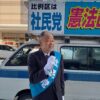 新社会党道本部小柳政行書記長は、平和の尊さを訴え戦争させないことが大事。社民党に力を、政治の流れを変えよう!と。