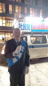 示から3日目を迎えた遊説隊、30日は札幌をスタートして函館に向かいました。沿線は雪と突風が吹き荒れるという真冬の選挙戦です。それでも鳴海一芳比例区候補をはじめ、相馬宏幸代表、浅野隆雄幹事長によるチーム道連合で比例区は社民党、今だから社民党を訴えています。