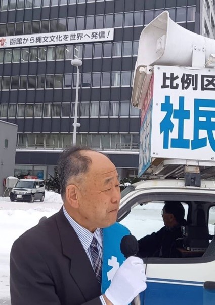 30日は午後6時から函館五稜郭公園、今朝は駅前で「国民生活を守る、その大前提が平和です。憲法を守り大軍拡に反対し、軍事費を削減し教育や福祉を充実しましょう!未来に希望を持てる社会の実現、それは消費税ゼロであり、労働者の実質賃金のアップです。社会民主党が求められていることを確信します。」と函館市民に訴えた。